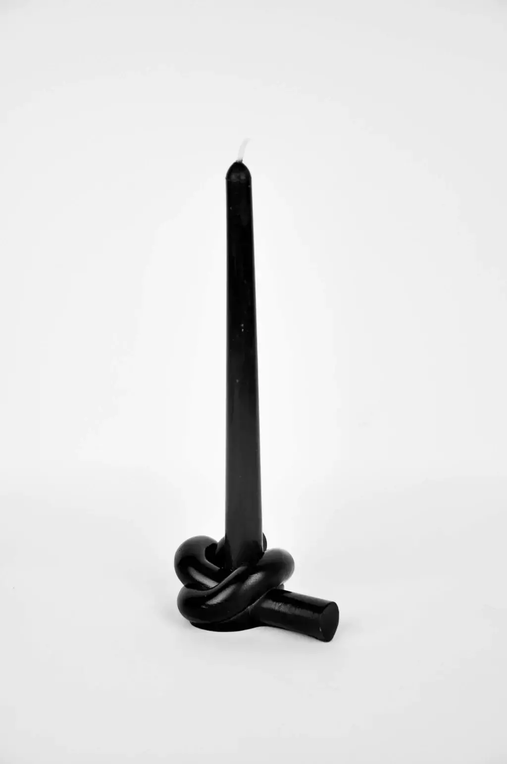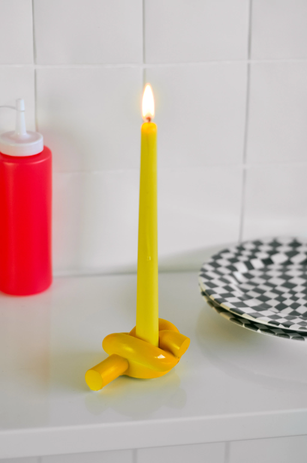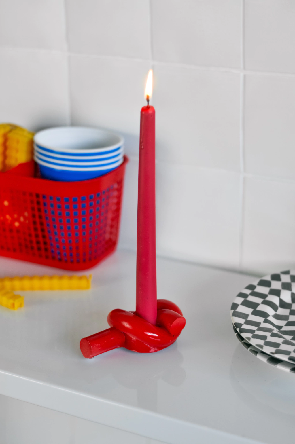 Esse castiçal é divertido e tem formato de nó. Com cores que lembram Ketchup e Mostarda, mexem com o lúdico e criativo.