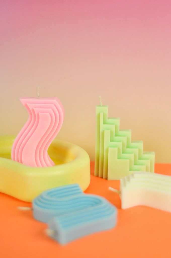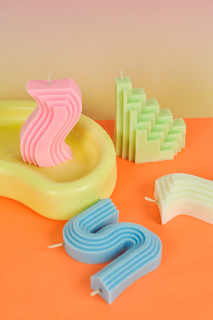 O KIT geométrico acompanha 3 velas (groovy, degraus e minhoca) com as mesmas cores. Descontraídas com aspecto minimalista, darão um up na decoração do seu ambiente. Por ter um design mais básico e jovial, combina com quartos, escritórios, sala, banheiro e qualquer lugar que desejar.