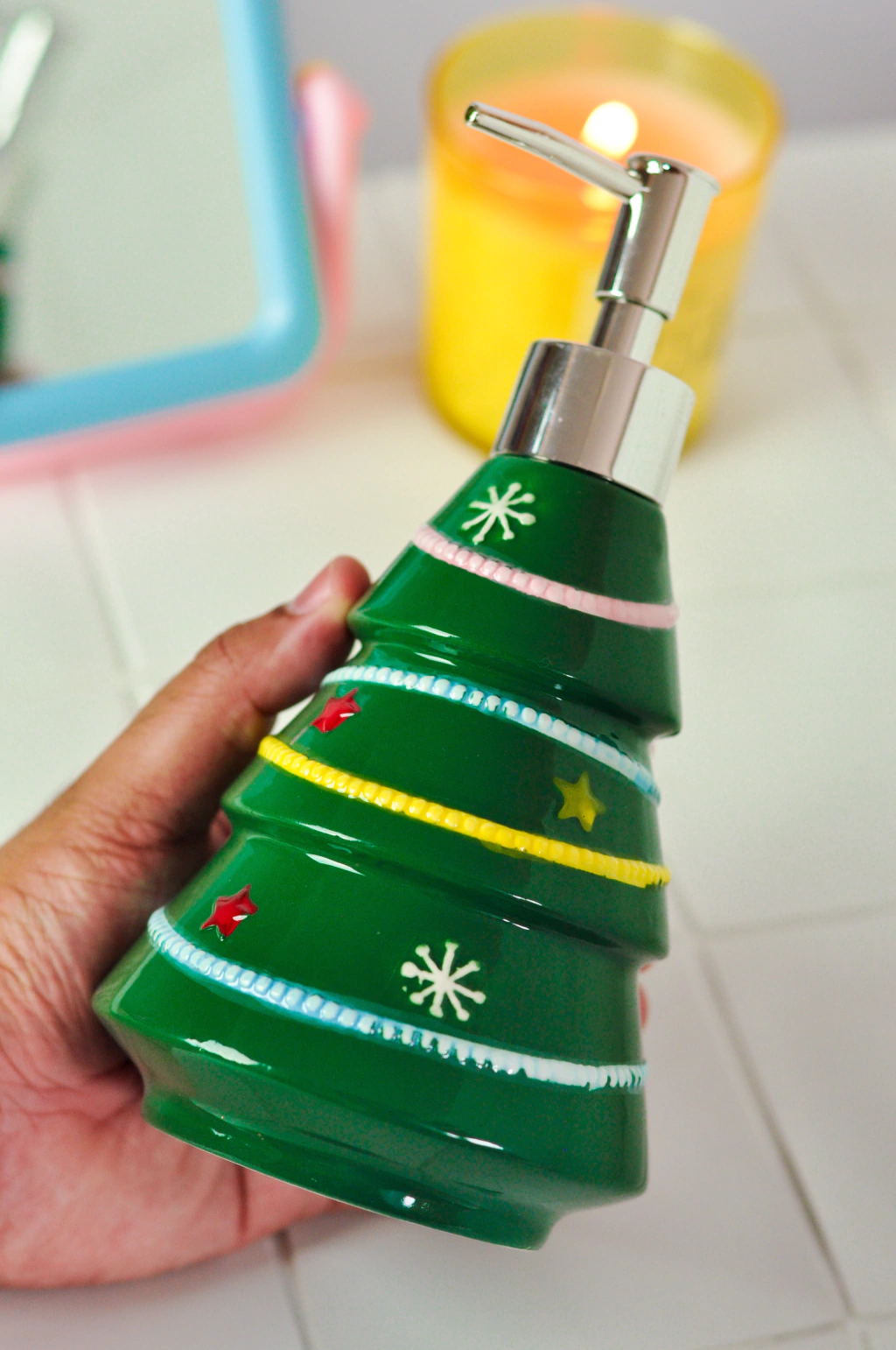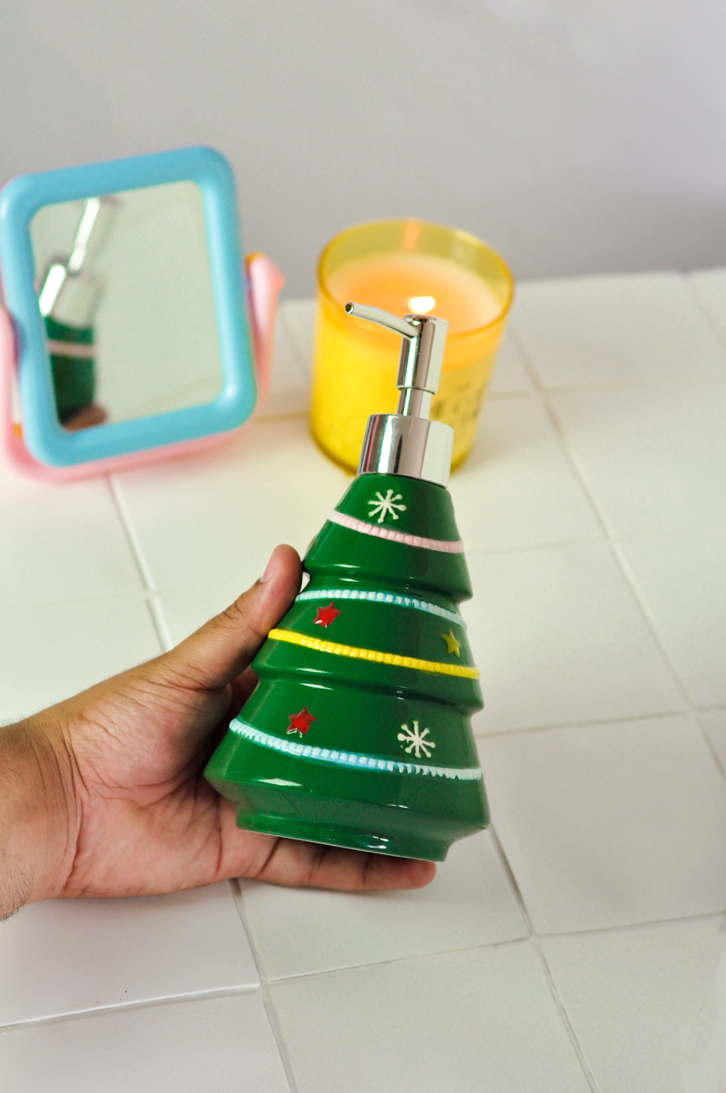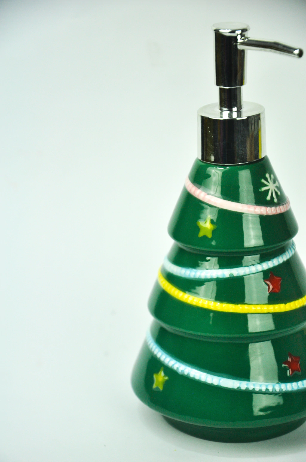 O porta sabonete líquido de porcelana perfeito para decorar o seu banheiro proporcionando um ponto de cor e utilidade. Com formato de árvore de natal, deixará todos impressionados com diversão.